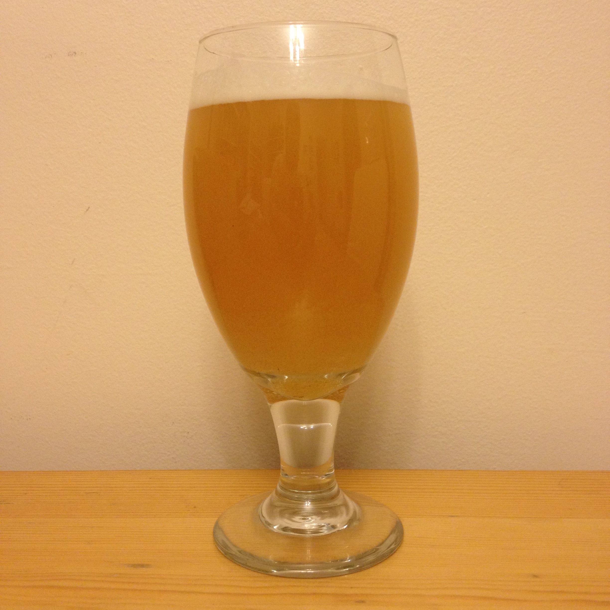 Beer served in a stemmed glass…beer is amber and really hazy (although this is a pretty early pour and these beers tend to get clearer as time goes on and I do nothing for clarity these days). Small white head, decent retention, some lacing, low carbonation (but this will also increase slightly over the coming week or so).