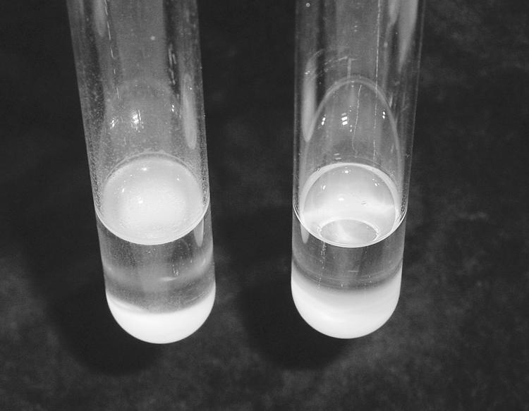 Cells expressing FLO11 (left) and cells not expressing FLO11. FLO11 expressing cells form a pellicle in the test tube (from "FLO11-Based Model for Air-Liquid Interfacial Biofilm Formation by Saccharomyces cerevisiae" 2005)
